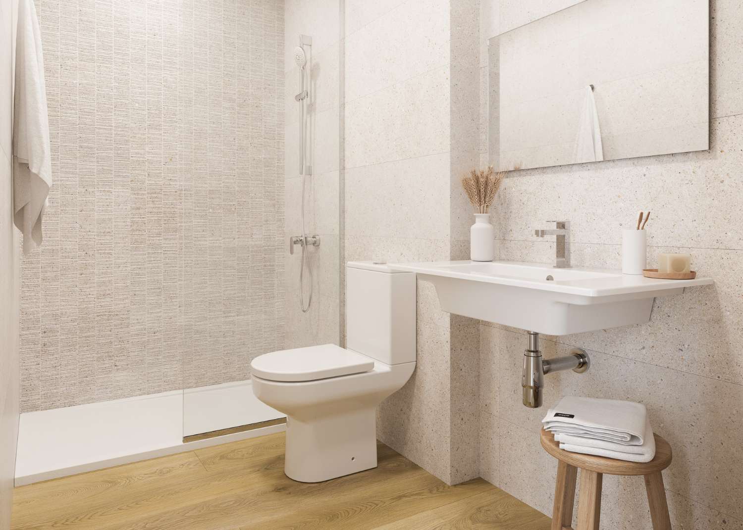 Todas las viviendas incluyen cocinas completamente equipadas (horno, vitrocerámica y campana), ventanas de aluminio con doble acristalamiento, armarios empotrados, baños completos y preinstalación de aire acondicionado.